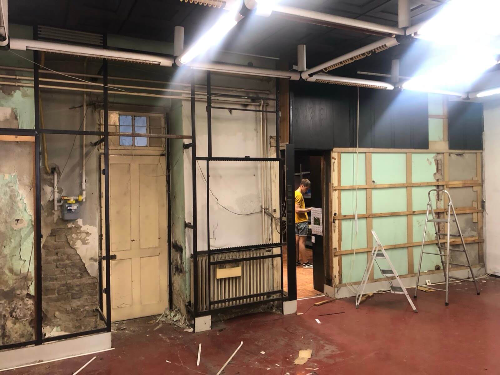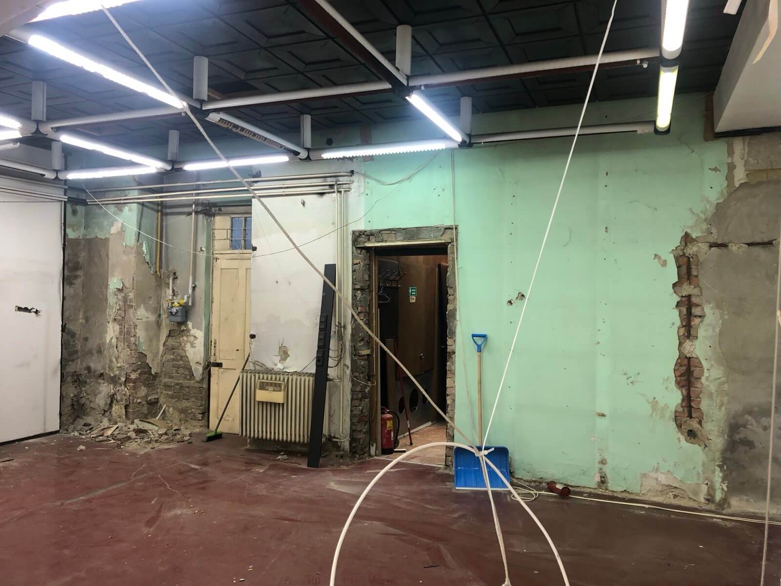 A régi, elhasználódott üzlethelyiségből modern, letisztult, inspiráló alkotói környezetet alakítottunk ki. A teljes belső teret újraterveztük, a fém és fa szerkezetű egyedi bútorokat, polcrendszereket, pénztárpultot is saját műhelyünkben gyártottuk és helyszínen szereltük be.